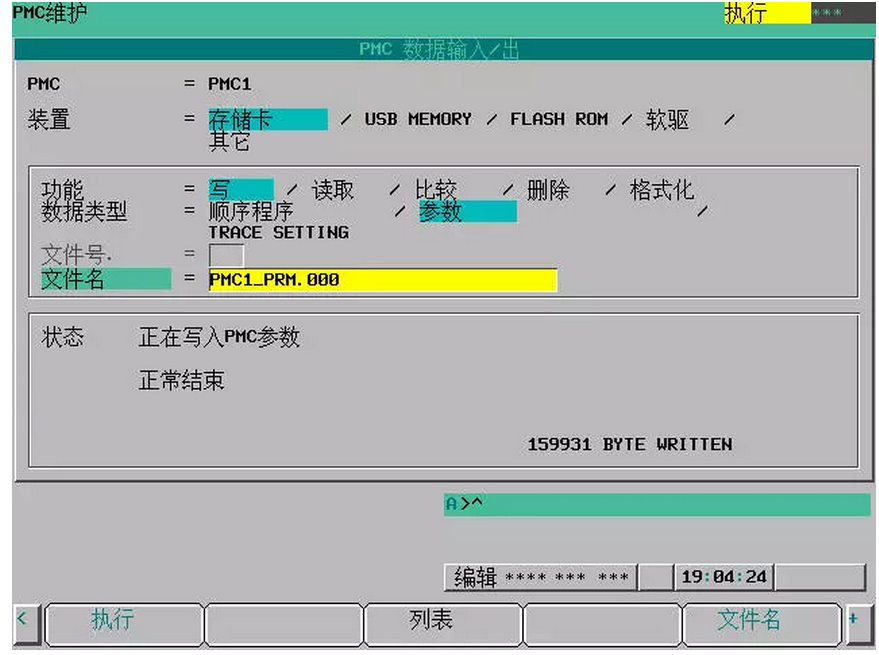 (2)輸出到存儲卡。按軟鍵【文件名】,生成默認文件名“PMC1_PRM.000”,再按【EXEC】,屏幕提示“正在寫入PMC參數”;